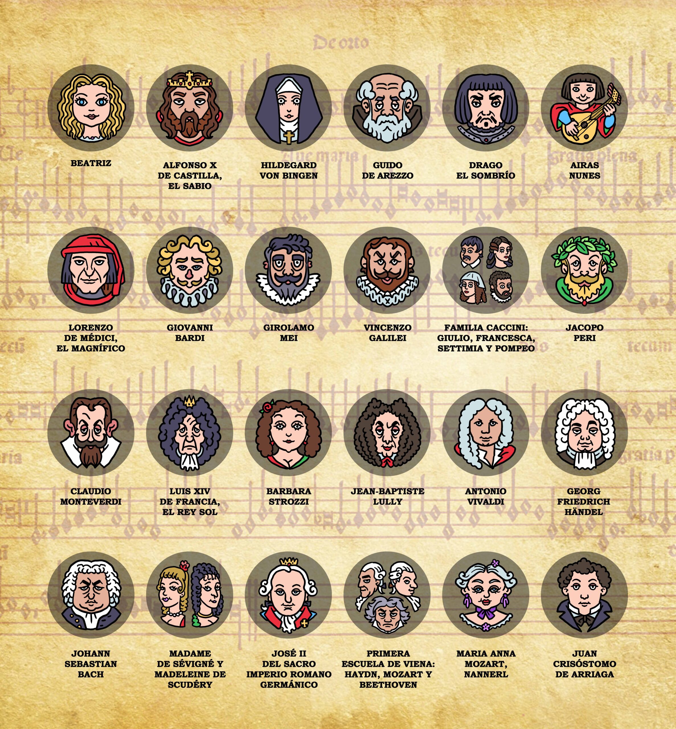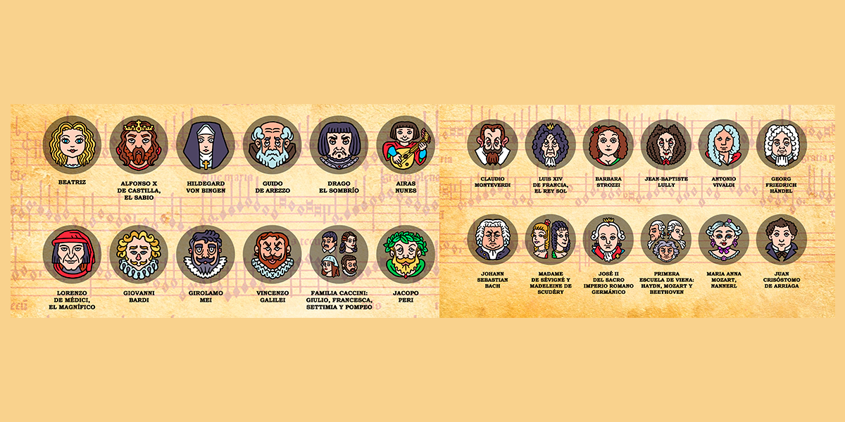 La ilustración de portada refuerza este recorrido vital. Presenta a Beatriz rodeada de grandes figuras de la historia de la música —de Hildegard von Bingen a Bach, Vivaldi, María Anna Mozart o Juan Crisóstomo de Arriaga—, representadas con estilo narrativo e iconográfico propio del universo Ñ. Más que un retrato coral, la imagen funciona como una genealogía de maestros: cada personaje encarna una época o una corriente que acompaña simbólicamente el aprendizaje de la protagonista.
